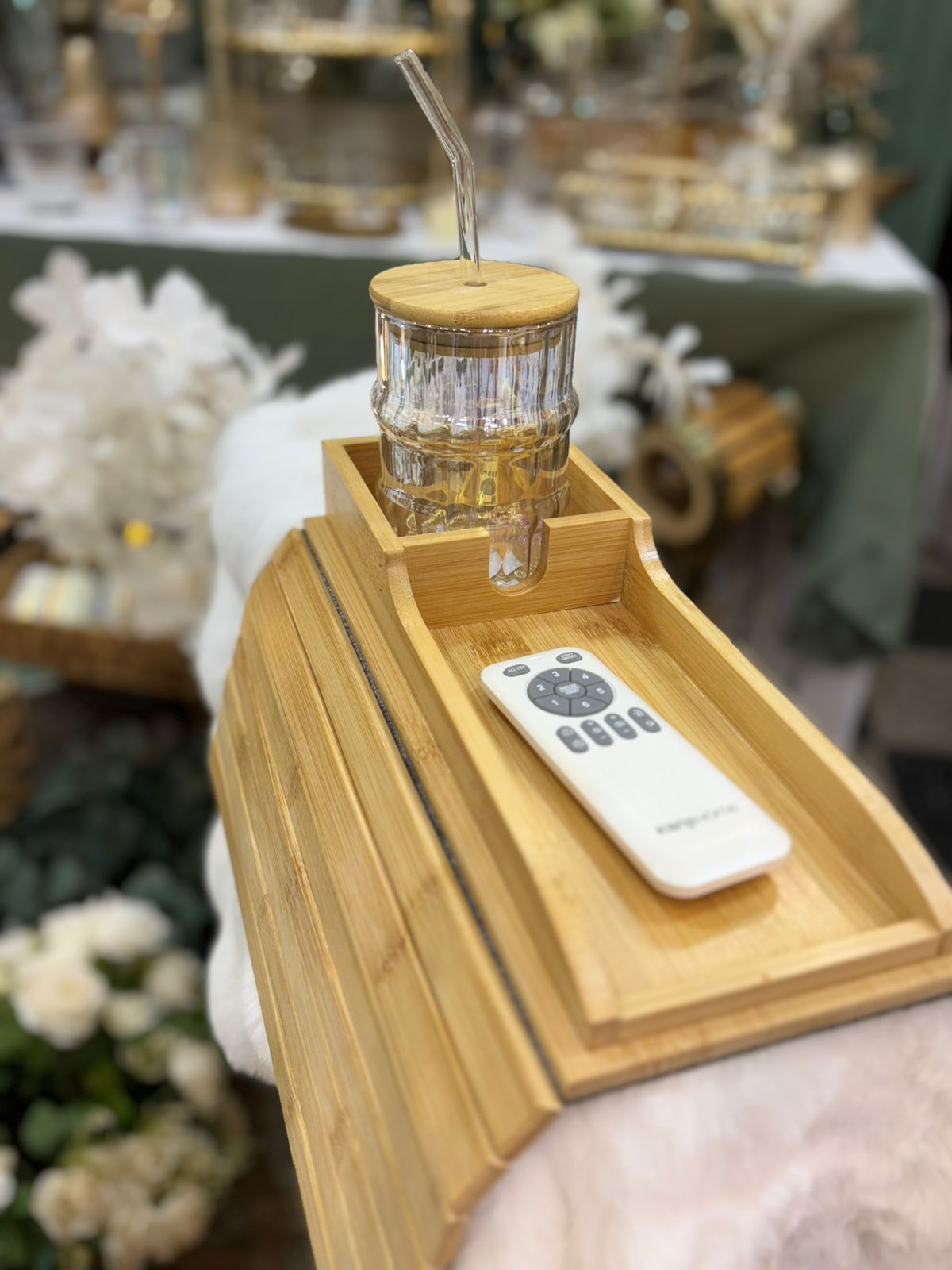 Bandeja flexible para sillon con soporte porta vasos y porta objetos de bambu con antideslizante 42 x 33cm aprox.