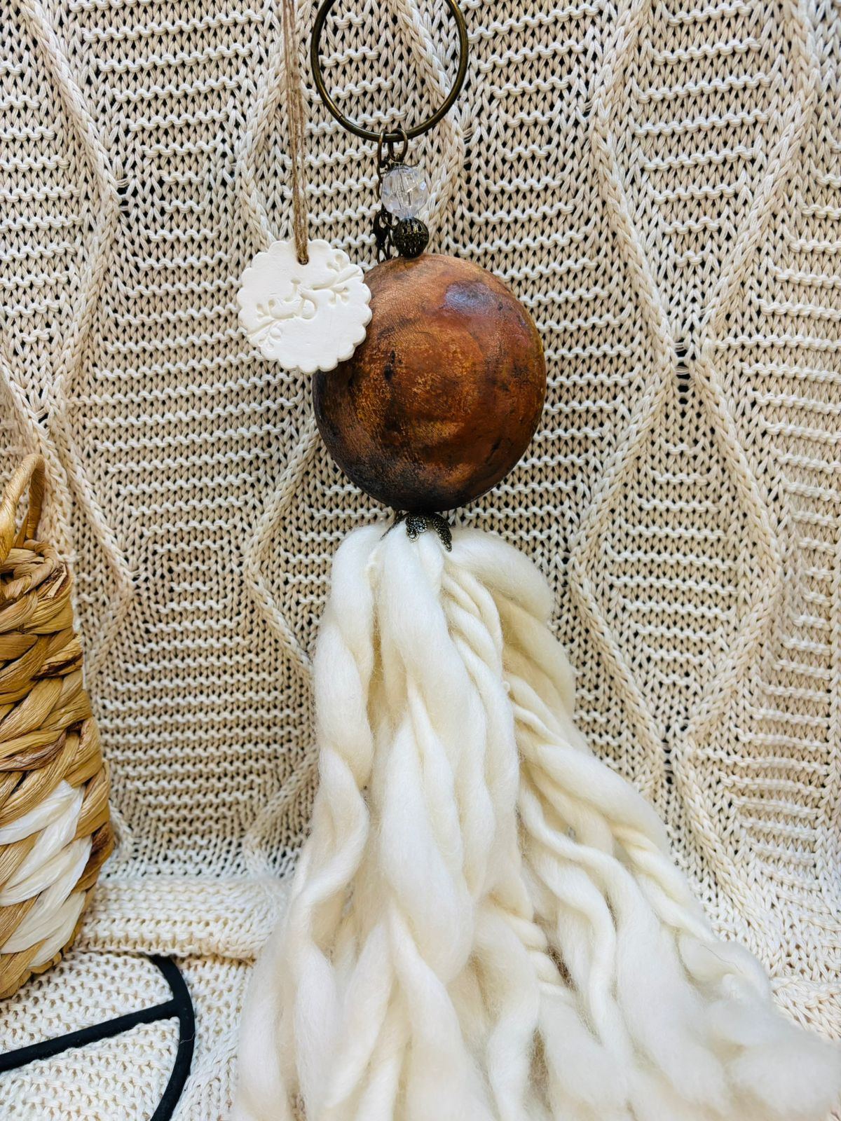 Borla medallón cerámica pintada a mano efecto madera de 10cm de diametro. puede utilizarse como borla de cortina, colgante, o puertero.